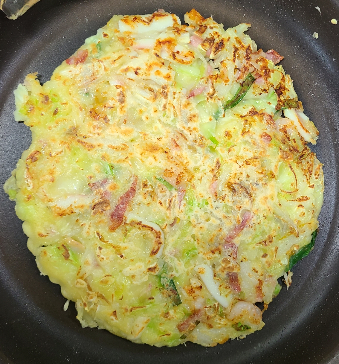 쿡솜씨 밀키트로 완성된 해물오꼬노미야끼입니다! 지름 약 20cm 내외로 두장이 나오더라고요. 저희 부부 기준으로는 딱 알맞은 양이었습니다.